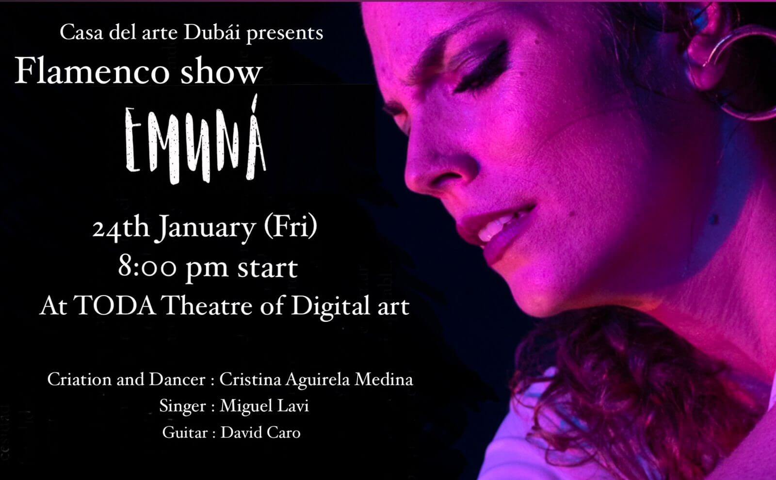 Presentado por Casa del Arte Dubái, “Emuná” es una creación de la reconocida bailaora Cristina Aguilera Medina, quien estará acompañada por dos destacados artistas españoles: el guitarrista David Caro y el cantaor Miguel el Lavi.